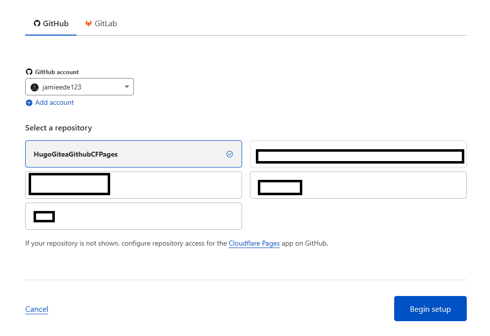 Only select repositoriesand then select the repository you created on GitHub, in this case,HugoGiteaGithubCFPages - Under