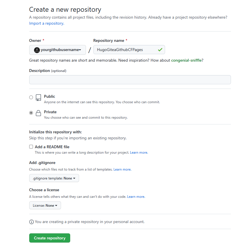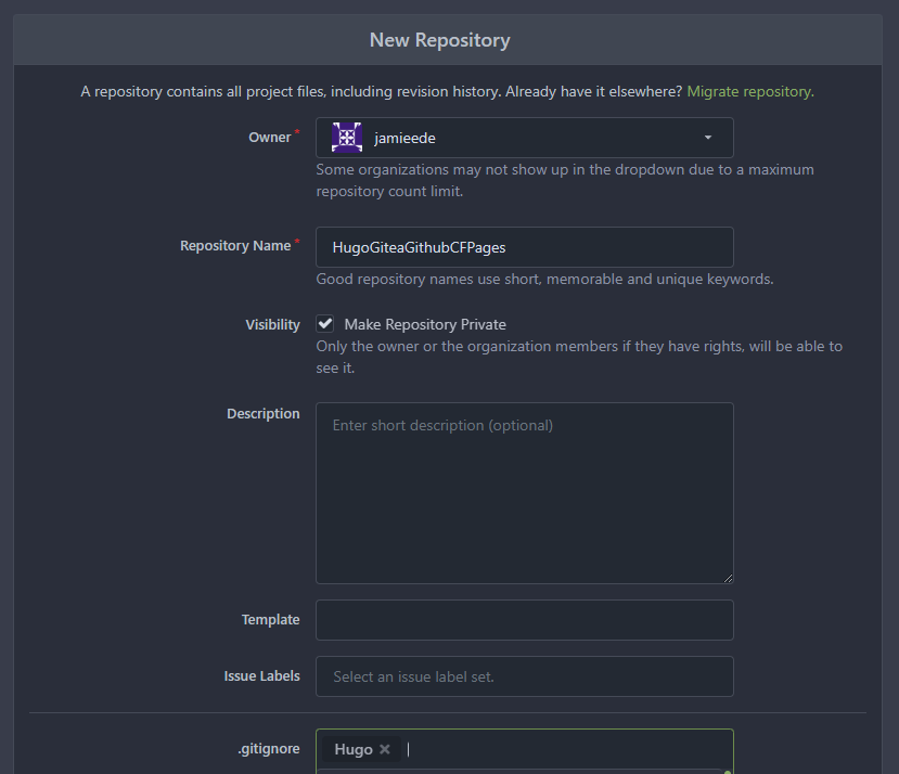 Repository namesuch asHugoGiteaGithubCFPages(it can be anything you choose) - Make the repo