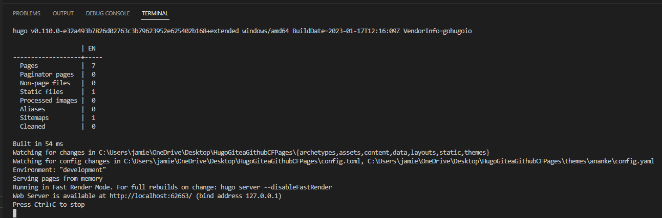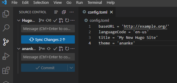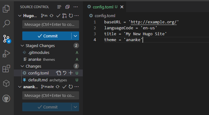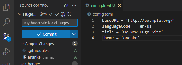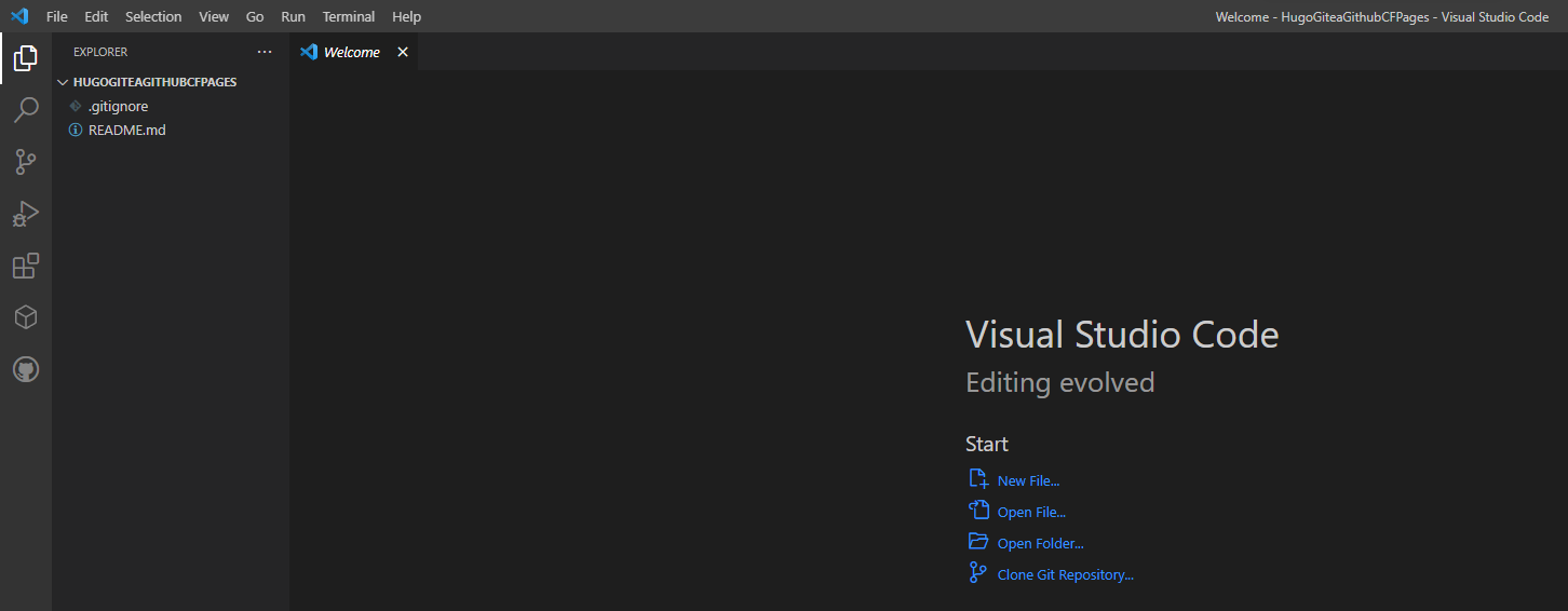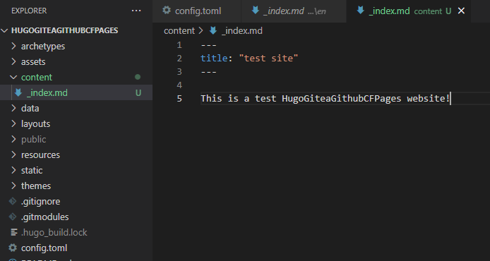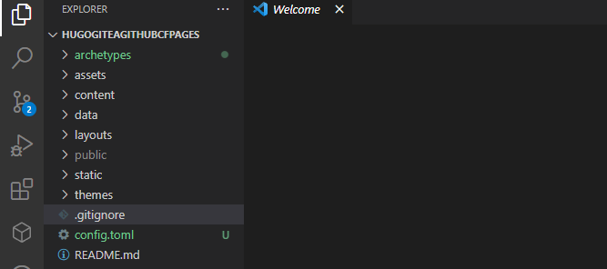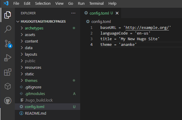 This will create a basic Hugo website in the root of your HugoGiteaGithubCFPages, your directory will look like this once done: