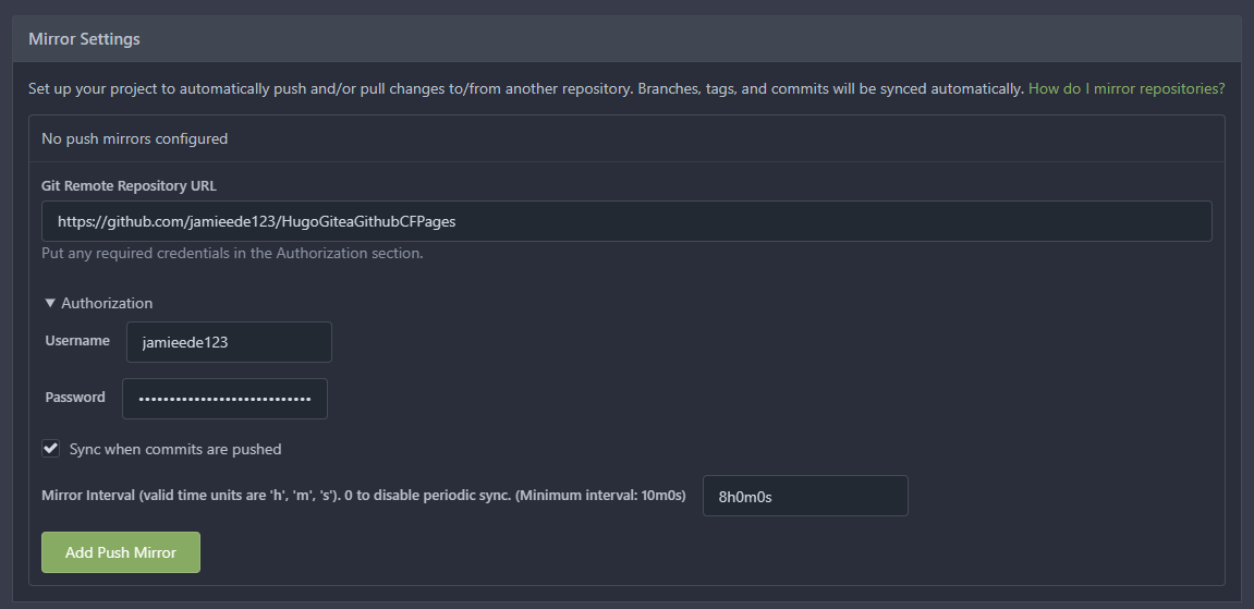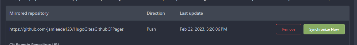 Git Remote Repository URLtext box enter yourGitHubrepo URL, in my case:https://github.com/jamieede123/HugoGiteaGithubCFPages - Expand the