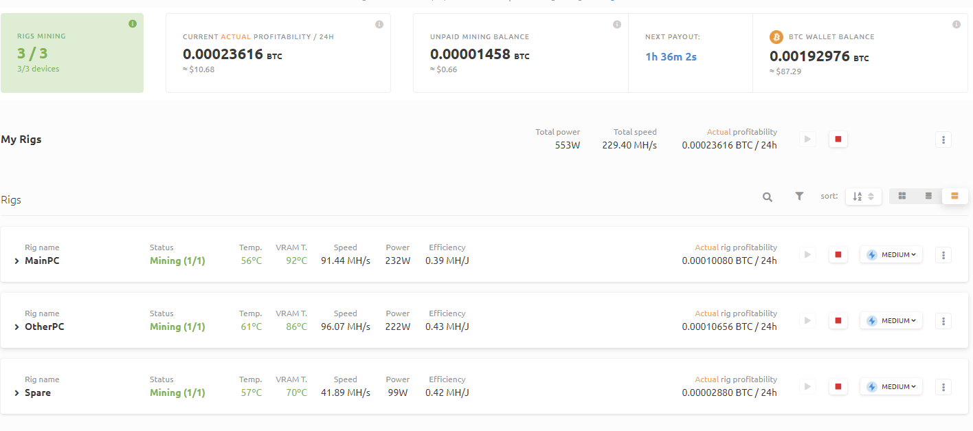 I use the Nicehash Quickminer on all the rigs. Below is a breakdown as of 4th April 2022 of the profitability of each rig.